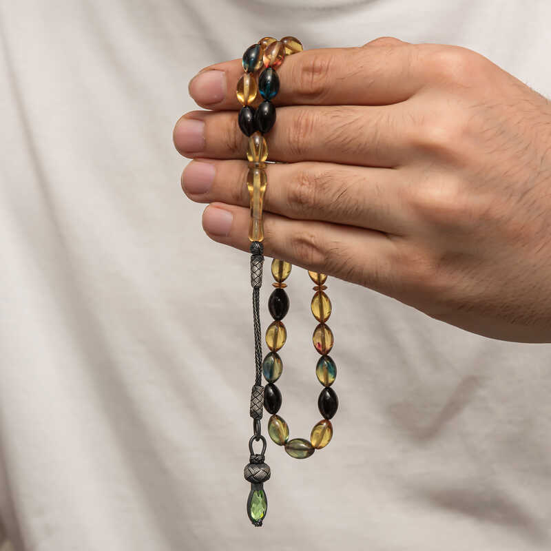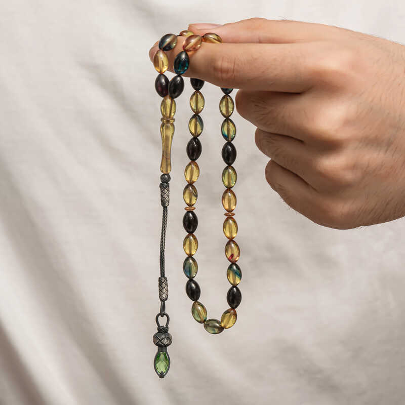 Kehribar, çam ağacı reçinesinin toprak altında uzun yıllar boyunca birikerek oluşan bir maddedir. Hemen hemen taş ile aynı sertliktedir fakat yoğunluğu düşüktür. Çam kokusu yayar. Oluşumu uzun zaman aldığından ve yapay olarak yapılamadığından değerli bir maddedir. Sıkma kehribar ise kehribar taşından farklı olarak onun özelliklerini taşıyan, görüntü itibariyle ona benzeyen fakat gerçek olmayan bir malzemedir. Ülkemizde ve dünyanın bir çok yerinde kehribar taşından çeşitli malzemeler üretilmiştir. Ülkemizde en yaygın olarak tesbih üretilmektedir. Kehribar tesbihler elde ısındıkça kehribar benzeri bir koku verir ve renk değiştirir. Bir çok rengi vardır. Hatta iki rengin birleşiminden oluşan kehribar tesbih modelleri de vardır. Genellikle gümüş püskül ile kullanılır veya sistemli olarak da kullanılabilir. Ülkemizin güzide tesbih ustaları bu malzemeyi sıklıkla işlemek suretiyle çeşitli sanat eserleri meydana getirirler. Bu tesbihler de koleksiyonerler tarafından alınıp satılmaktadır. Gümüş 1000 ayar kazaz püsküllü sıkma kehribar tesbih modeli de günlük hayatta kullanılabilecek çok şık bir tesbih çeşididir. Özel günlerin vazgeçilmez hediyesi sıkma kehribar tesbihler erkekler için doğum günü, sevgililer günü ve babalar günü gibi özel zamanlarda hediye olarak tercih edilebilir. Gümüş kazaz püsküllü sıkma kehribar tesbih modeli diğer kehribar tesbih modellerinde olduğu gibi tamamen el emeği ile imal edilmiştir.