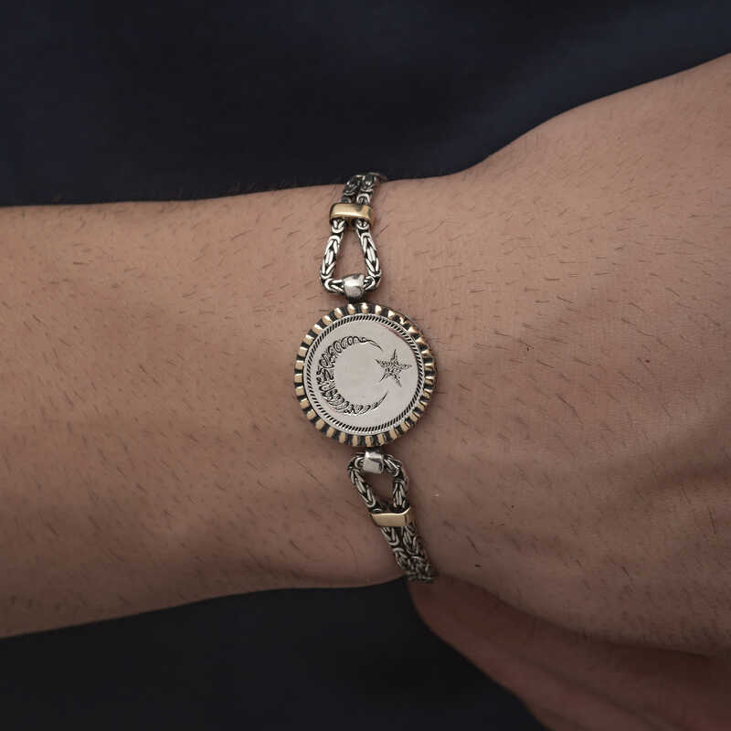 Türk bayrağının ilhamını da kan gölüne yansıyan ay ve yıldızdan aldığını biliyoruz. Bayrağın taşıdığı kutsal anlamı bileklerinde taşımak ve sevdiklerinizle paylaşmak için kaçırılmayacak bir fırsat sunuyoruz. Bu şık Ay yıldız bileklik modeli 925 ayar gümüşten imal edilmiştir. Gümüş üzerine oksit kaplama yapılmıştır. Gümüş oksit, kaplanan ürünler hafif siyah renklendirmeye ve antik bir görünüm elde etmeye yaramaktadır. Ay yıldız erkek bileklik 925 ayar gümüşten imal edilmiştir. Gümüş ve değerli taşlar nedeniyle belirtilen ortalama ürün ağırlığında ± %10 sapma olabilmektedir.