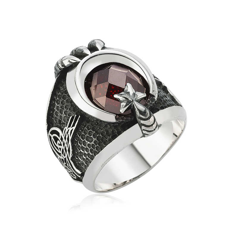 Tuğra Osmanlı devleti padişahlarının şahsi imzalarıdır. Her padişahın imzası birbirinden farklıdır. Günümüzde takılarda sıklıkla kullanılan bir motiftir. Sadece tuğra değil ay yıldız motifi de bayrağımızı simgelediği için sıklıkla kullanılır. Hilal ve yıldız ya da ay-yıldız; hilal ve hilalin açık ucunda yer alan bir yıldız şeklinden oluşan antik semboldür. Bu sembolün kullanıldığı bayraklara çoğunlukla Akdeniz bölgesi civarında, Orta Doğu ve Orta Asya'da rastlanır. Günümüzde çoğunlukla İslam ülkelerinin bayraklarında kullanılan bir sembol olarak bilinmektedir. Ay- Yıldız simgesi, Türk Bayrağı dahil bir çok bayrakta yer almaktadır. Ay ya da Hilâl, İslâm dini ile özdeşleşmesine rağmen, İslâm öncesi dönemlerde de kullanılmış; Ay- Yıldız ve Güneş motifleri Amerika, Avrupa, Anadolu, Ortadoğu ve Orta Asya panteonunda tarih boyunca yer almıştır. Orta Asya’da İÖ. 5000’lere ait kaya resimlerinden başlayıp daha sonraki şaman davullarında da benzer şekilde tasvir edilen Ay- Yıldız ve Güneş motifleri, Asyalı Türk- Moğol halklarının evren tasarımı hakkında bilgiler sunar. Fakat Ay ile Yıldız’ın birlikte tasvir edildiği ilk belgeler Mezopotamya’da bugünkü Güney Irak’taki Sümer şehirlerinde ortaya çıkmıştır. Gümüş ay yıldız tuğra erkek yüzük modeli severek kullanabileceğiniz ve sevdiklerinize armağan edebileceğiniz bir çok şık bir aksesuardır. Ay yıldız tuğra erkek yüzük modeli 925 ayar gümüş kullanılarak imal edilmiştir. Yüzük üzerine oksit kaplama yapılmıştır. Oksit kaplama yapılan gümüş ay yıldız tuğra erkek yüzük modelleri eskitme bir görünüme kavuşur. Gümüş ay yıldız tuğra erkek yüzükte olduğu gibi tüm gümüş erkek yüzük modelleri tamamen el emeği ile üretilmiştir. Gümüş ve değerli taşlar nedeniyle belirtilen ortalama ürün ağırlığında ± %10 sapma olabilmektedir.