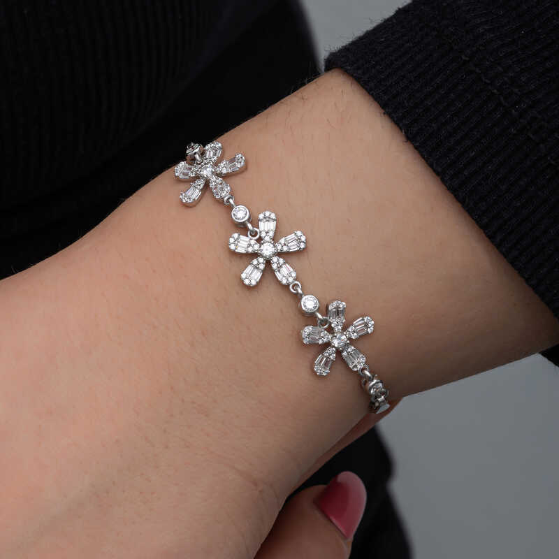Modaya uyumlu şekilde tasarlanan gümüş baget bileklik modellerini hem gündelik yaşantınızda hem özel gün ve gecelerinizde şık bir şekilde kullanabilirsiniz. Yenilikçi her yaştan kadının beğenisine hitap eden ürünlerle kombinlerinizi tamamlayabilirsiniz. Her biri farklı bir stile hitap edebilen tasarımlarla sizler de spor, klasik ve alternatif giyim tarzlarınıza uygun modellerimizi tercih edebilirsiniz. Bu şık bileklik; doğum günü hediyesi, sevgililer günü hediyesi veya özel günlerde tercih edilebilecek mükemmel bir seçenektir. Gümüş baget taşlı çiçek desenli kadın bileklik 925 ayar gümüşten imal edilmiştir. Bu bileklik üzerine rodyum kaplama yapılmıştır. Rodyum kaplama yapılan ürünler parlaklığını uzun süre muhafaza eder, oksitlenmesini geciktirir. Tüm gümüş kadın bileklik modellerinde olduğu gibi gümüş baget taşlı kadın bileklik modeli de el emeği ile üretilmiştir. Gümüş ve değerli taşlar nedeniyle belirtilen ortalama ürün ağırlığında ± %10 sapma olabilmektedir.