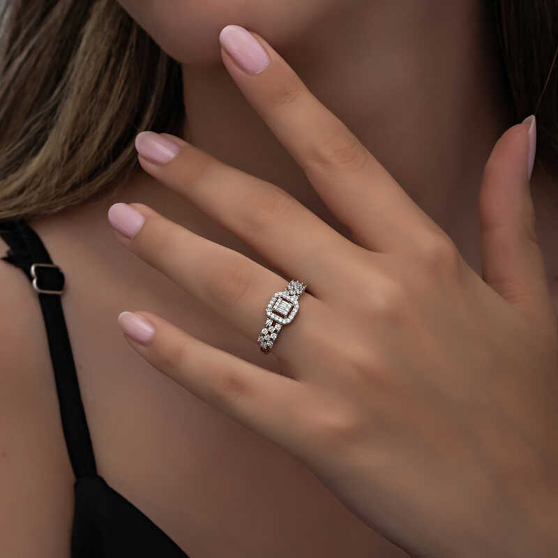 Işıl ışıl baget taşlarla süslenmiş bu şık yüzük modeli; doğum günü hediyesi, sevgililer günü hediyesi veya annelere hediye olarak özel günlerde tercih edebileceğiniz çok şık bir seçenektir. Baget taşlı kadın yüzük 925 ayar gümüşten imal edilmiştir. Gümüş üzerine rodyum kaplama yapılmıştır. Rodyum kaplama yapılan gümüş yüzükler parlaklığını uzun süre muhafaza eder, oksitlenmesi gecikir. Üzerinde bulunan taşlar baget ve zirkondur. Tüm kadın gümüş yüzüklerde olduğu gibi gümüş baget taşlı kadın yüzük modeli de el emeği ile üretilmiştir. Gümüş ve değerli taşlar nedeniyle belirtilen ortalama ürün ağırlığında ± %10 sapma olabilmektedir.