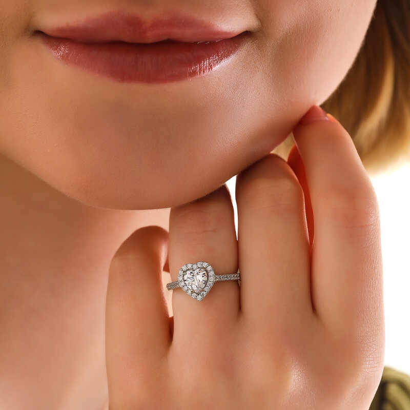 Gümüş Beyaz Taşlı Kalpli Kadın Yüzük