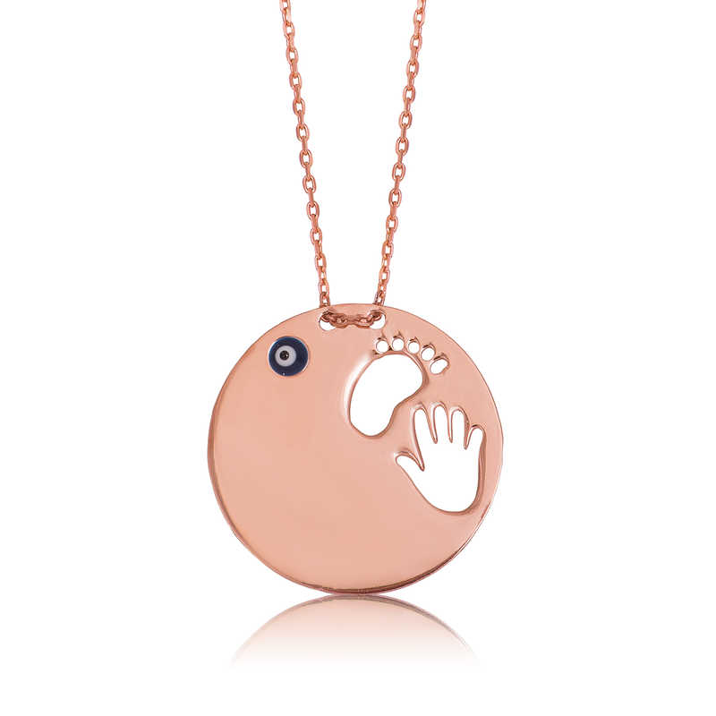 Masumiyeti ve saflığı simgeleyen el ve ayak izi kolye hayatta en değerli varlığınız olan anneniz için en anlamlı hediyelerden biri olacaktır. El ayak izi anne kolye 925 ayar gümüşten imal edilmiştir. Gümüş üzerine rose kaplama yapılmıştır. Rose kaplama yapılan gümüş bayan kolye modelleri parlaklığını uzun süre muhafaza eder. İstenildiği takdirde kolye üzerinde isim ve tarih yazılabilir. Kolye üzerindeki nazar boncuğu soğuk mine yöntemiyle yapılmıştır. Gümüş olan zincir boyu ortalama 45 cm'dir. Gümüş el ayak izi anne kolye modeli diğer tüm gümüş bayan kolye modellerinde olduğu gibi el emeği ile üretilmiştir. Gümüş ve değerli taşlar nedeniyle belirtilen ürün ağırlığında ± %10 sapma olabilmektedir.
