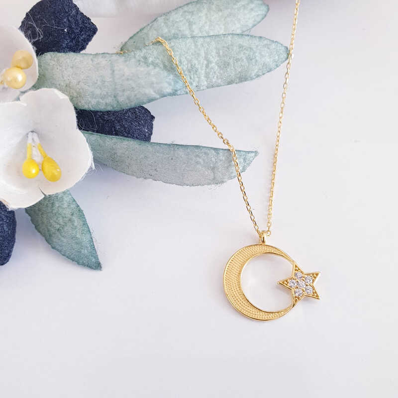 ???Gümüş Gold Ay Yıldız Kadın Kolye