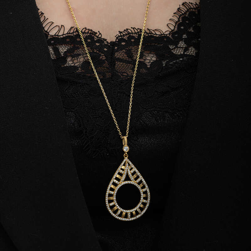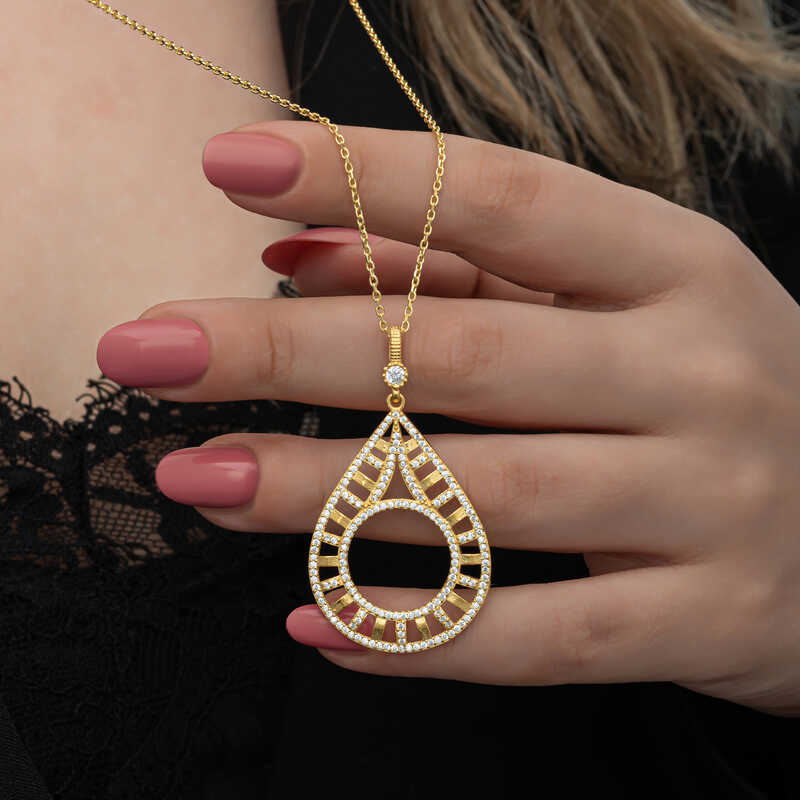 Damla form deseniyle şıklığı ifade eden gümüş çeyrek takılabilen altın kadın kolye modeli ile sevginiz, sevdiğiniz kadının teninde hayat bulsun. Genç sevgililerin ve kendini genç hissedenlerin özel günlerde de seçebileceği bu kadın kolye modeli ile sevdiğinizin bileğini aşkla süsleyin. Sizin olduğu kadar sevdiklerinizin de keyifle takacağı kadın kolye sevdiğinize en güzel hediyelerden biri olacaktır. Bu kadın kolye modeli 925 ayar gümüşten imal edilmiştir. Gümüş üzerine altın kaplama yapılmıştır. Altın kaplama yapılan gümüş kadın kolye modelleri parlaklığını uzun süre muhafaza eder ve oksitlenmesi gecikir. kolye üzerinde bulunan beyaz taşlar zirkondur. Tüm kadın kolye modellerinde olduğu gibi gümüş kadın kolye modeli de el emeği ile üretilmiştir. Gümüş ve değerli taşlar nedeniyle belirtilen ortalama ürün ağırlığında ± %10 sapma olabilmektedir.