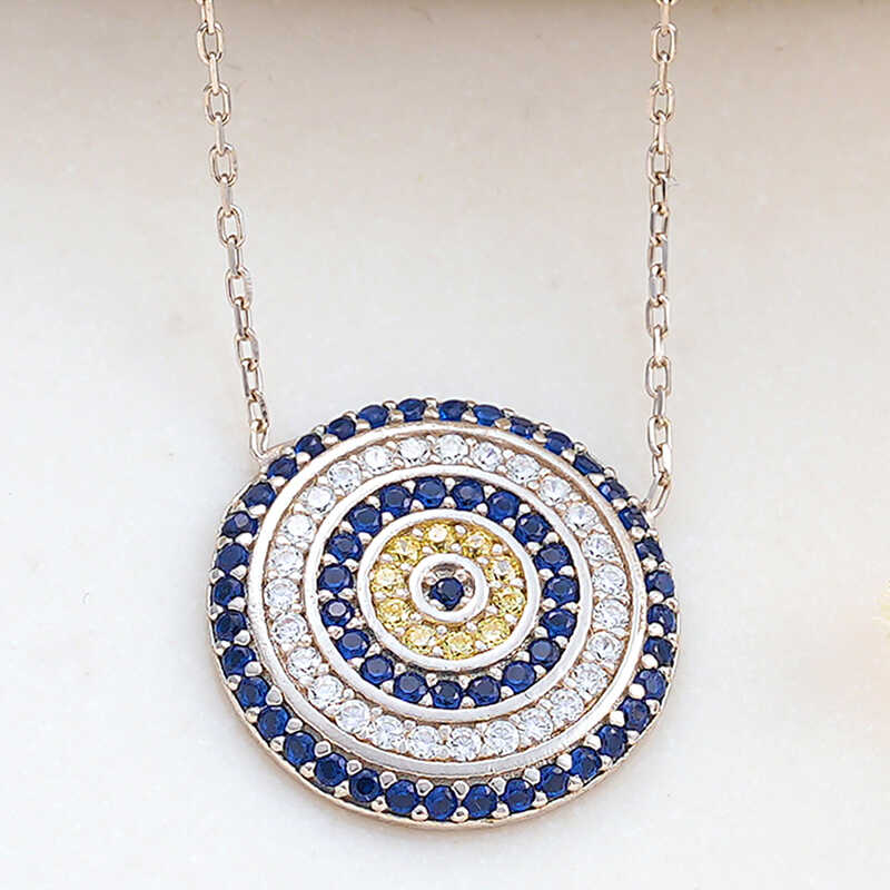 Birçok kültürde kötü enerjinin zararlarından korunmak için çeşitli tılsımlar kullanılmıştır. Doğu kültürlerinin çoğunda kullanılan tılsım ise gözdür. Nazar boncuğu da göz şeklinden ilhamla tasarlanmıştır. Mavi rengin seçilmesi de tesadüf değildir. Renkli gözlü kişilerin enerjisini daha etkili yansıttığı inancı gereği nazar boncukları çoğunlukla mavi olarak tasarlanır. Güzelliğiyle göz kamaştıran, nazardan korunmasını istediğiniz kişilere ve sevdiklerinize nazar kolyeyi armağan edebilirsiniz. Nazar kadın kolye modeli 925 ayar gümüşten imal edilmiştir. Gümüş üzerine rodyum kaplama yapılmıştır. Rodyum kaplama yapılan gümüş nazar kolye modelleri parlaklığını uzun süre muhafaza eder ve oksitlenmesi gecikir. Kolye üzerinde bulunan taşlar zirkon'dur. Bu nazar kadın kolye modeli diğer tüm gümüş kadın kolye modellerinde olduğu gibi el emeği ile üretilmiştir. Gümüş ve değerli taşlar nedeniyle belirtilen ortalama ürün ağırlığında ± %10 sapma olabilmektedir.