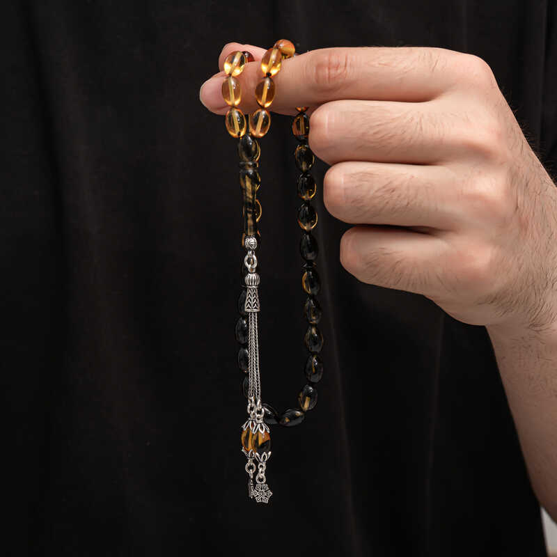 ?Gümüş Püskül Sıkma Kehribar Tesbih