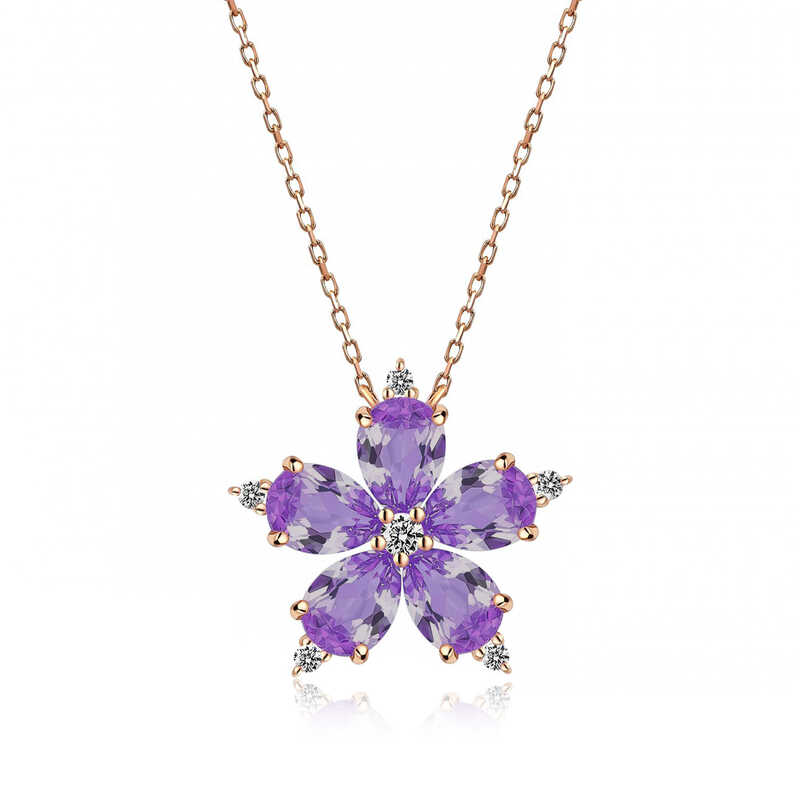 ?Gümüş Rose Lila Kamelya Çiçeği Kolye