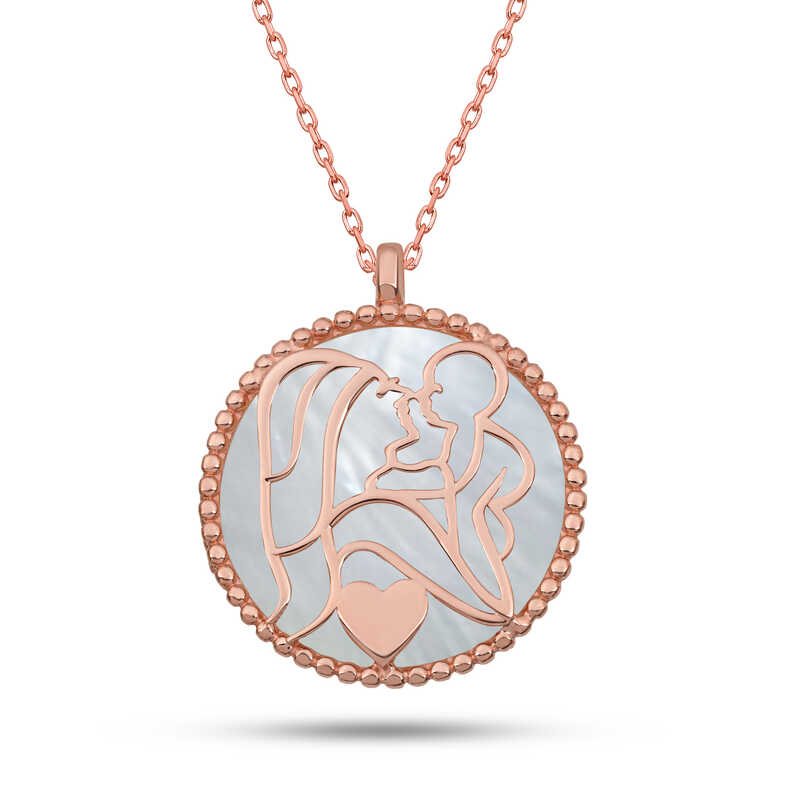 Çocuk ve anne arasındaki sevgiyi temsil eden özel bir tasarımdır.Bu kolye,sevgi,bağlılık ve şefkat duygularını ifade eder.Annenize olan bağlılığınızı belirtmek için alabileceğiniz en uygun hediyelerden biri bu anne ve bebek kolyesi olacaktır.Anneniz için tasarlanan bu özel tasarım sedef taşlı anne çocuk kolyesi 925 ayar gümüşten imal edilmiştir.Gümüş üzerine rose kaplama yapılmıştır.Rose kaplama yapılan gümüş anne çocuk kolye modelleri parlaklığını uzun süre muhafaza eder ve oksitlenmesi gecikir.Gümüş olan zincir boyu ortalama 45 cm'dir.Gümüş anne çocuk kolyesi el emeği ile üretilmiştir. Gümüş ve değerli taşlar nedeniyle belirtilen ortalama ürün ağırlığında ± %10 sapma olabilmektedir.