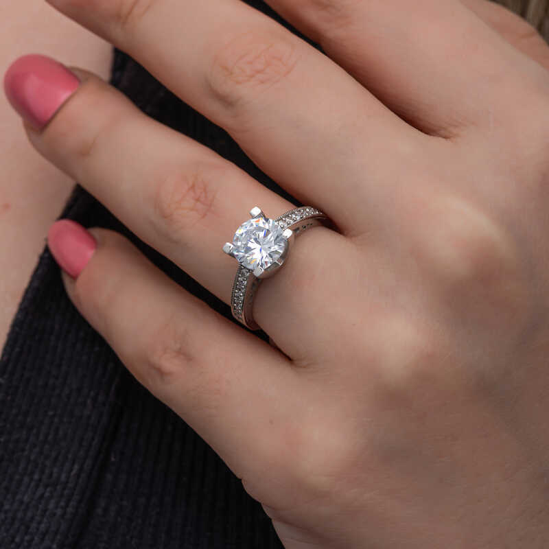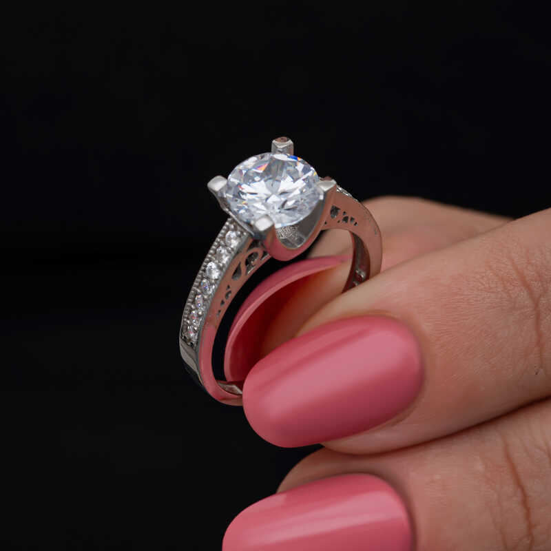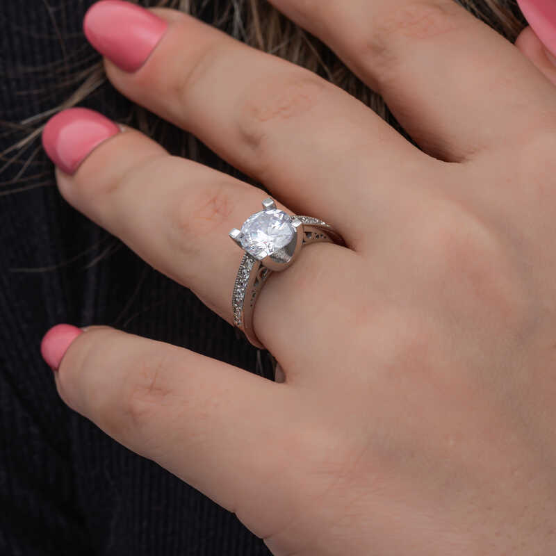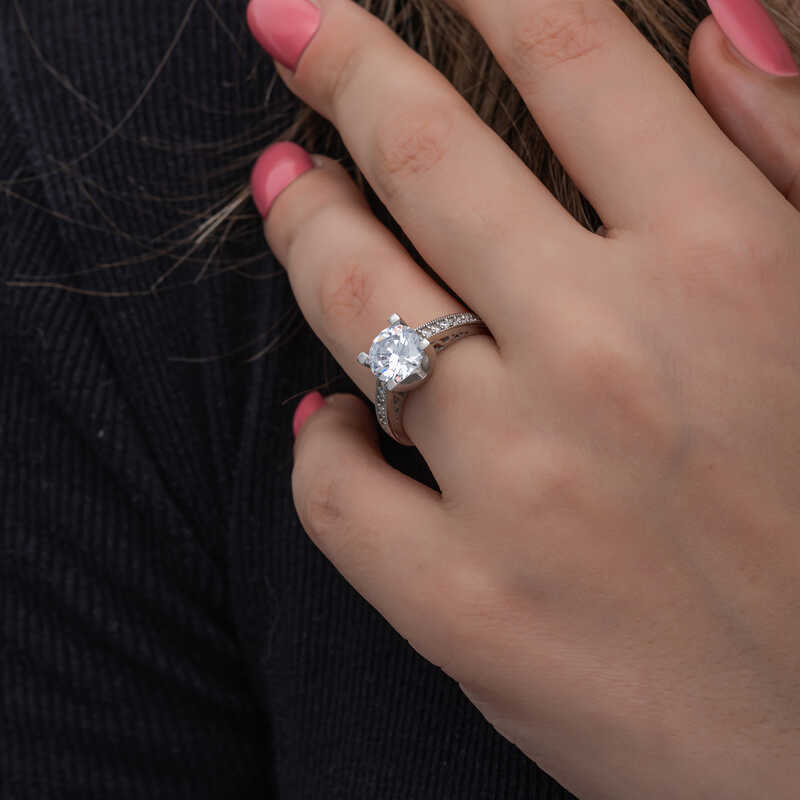 Bu özel tasarım tek taş yüzük 925 ayar gümüşten imal edilmiştir. Gümüş üzerine rodyum kaplama yapılmıştır. Rodyum kaplama yapılan kadın gümüş yüzük modelleri parlaklığını uzun süre muhafaza eder, oksitlenmesi gecikir. Yüzük üzerinde bulunan taşlar zirkondur. Sevdiğinize doğum günü, sevgililer günü ve özel günlerde verebileceğiniz mükemmel bir hediye seçeneğidir. Gümüş kadın yüzük modellerimizin tamamında olduğu gibi bu tek taş kadın yüzük de tamamen el emeği ile üretilmiştir. Gümüş ve değerli taşlar nedeniyle belirtilen ortalama ürün ağırlığında ± %10 sapma olabilmektedir.